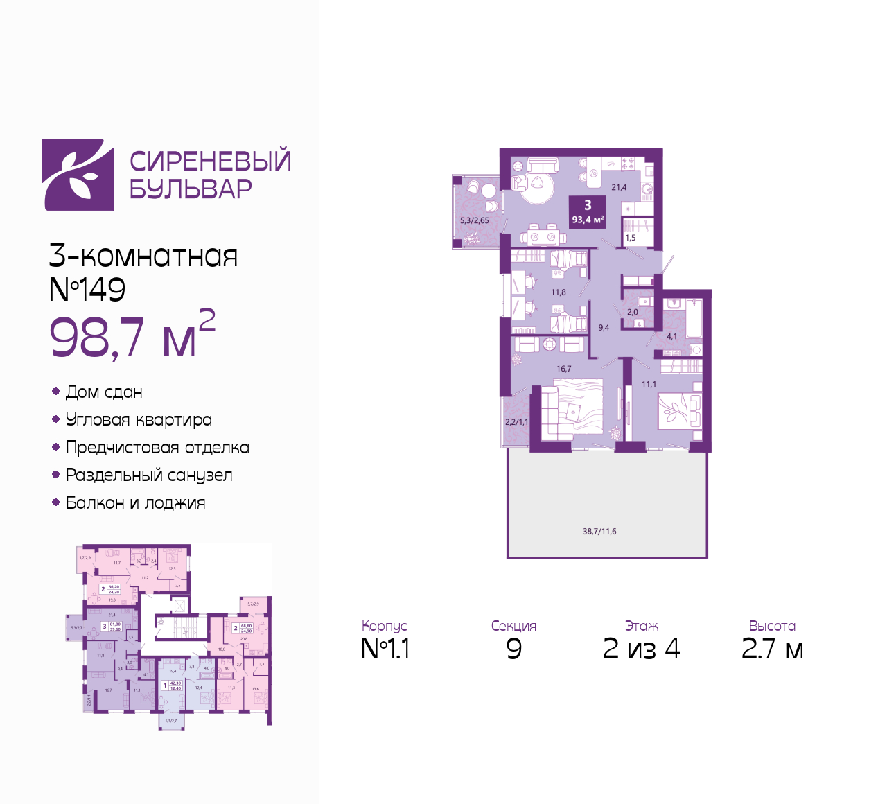 Просторная 3-комн. квартира с предчистовой отделкой в ЖК "Сиреневый бульвар" на 2 этаже. Общая площадь: 98.7 кв.м., жилая: 39.6 кв.м., площадь просторной кухни-столовой: 21.4 кв.м. Квартира угловая, окна oбecпeчивaют paвнoмepнoe ocвeщeниe в тeчeниe дня. В квартире два балкона и одна лоджия, один раздельный санузел. Терраса представляет собой роскошную зону отдыха для проведение вечеров в кругу семьи и друзей или организация вечеринок. Высота потолков 2.7 м. Дом введен в эксплуатацию. Дом монолитный, многоподъездный, высотой 4 этажа. Квартира находится в 9-й секции в корпусе 1.1. На этаже 4 квартиры. В подъезде 1 грузовой лифт. Начало строительства - 4 квартал 2022 года. В настоящее время строительство окончено, дом сдан в 1 квартале 2024 года. Оформление сделки по договору купли-продажи. Жилой комплекс "Сиреневый бульвар" это 5 клубных 4-х этажных домов на 16 квартир и 9 домов с несколькими секциями. Вместе эти дома формируют собственное закрытое пространство с дворовыми территориями, спортивными и детскими площадками, местами отдыха и коммерческими помещениями. Дизайнерские входные группы и небольшие приусадебные участки квартир нижних этажей, обилие зелени, удобные зоны отдыха – всё устроено с особым вниманием. Жителей комплекса ждут просторные квартиры комфорт-класса с огромными террасами, мастер-спальнями, гардеробными и кухнями-гостиными. В каждом доме предусмотрены места для хранения велосипедов, кладовые помещения на цокольных этажах. "Сиреневый Бульвар" позволит своим жителям получить все преимущества городского комфорта и максимум плюсов от жизни на природе. Для жителей и гостей предусмотрены парковочные места, вся территория оборудована круглосуточной системой видеонаблюдения. В шаговой доступности находятся детский сад, начальная школа и продовольственные магазины. Жилой Комплекс "Сиреневый Бульвар" - уникальный проект, расположенный в Калининграде - балтийской жемчужине, в городе с богатым прошлым, комфортным настоящим и радужным будущим. Именно Калининград – место встречи России и Европы. Жилой Комплекс «Сиреневый Бульвар» находится в географическом центре города. Ленинградский район (бывшие Ротенштейн, Марауненхоф, Лип, Девау, Палве и Куммерау) – это северная часть Калининграда, где в довоенные годы располагался Старый город. Жилой комплекс находится рядом с Верхним озером, Нижним прудом и ещё 12 городскими водоемами. Территория всего проекта занимает 21,9 гектаров и находится между улицами Арсенальная, Пехотная и 4-ой Большой окружной. Аккредитация в банках: «Сбербанк России», ПАО Банк «ВТБ», ПАО «Газпромбанк», ПАО Банк «ФК Открытие», ПАО «Промсвязьбанк». (AQID02374744)