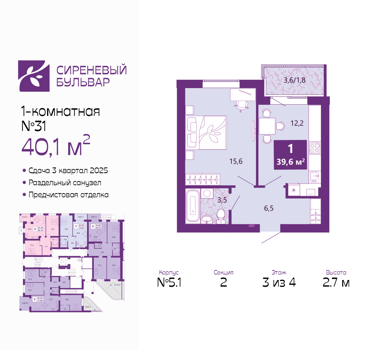 1-комн. квартира с первичной отделкой в ЖК "Сиреневый бульвар" на 3 этаже. Общая площадь: 40.1 кв.м., жилая: 15.6 кв.м., площадь просторной кухни-столовой: 12.2 кв.м. Все окна выходят на одну сторону. В квартире один балкон, один совмещенный санузел. Высота потолков 2.7 м. Дом монолитный, многоподъездный, высотой 4 этажа. Квартира находится во 2-й секции в корпусе 5.1. На этаже 6 квартир. В подъезде 1 грузовой лифт. Окончание строительства - 3 квартал 2025 года. Оформление сделки по договору долевого участия. Жилой комплекс "Сиреневый бульвар" это 5 клубных 4-х этажных домов на 16 квартир и 9 домов с несколькими секциями. Вместе эти дома формируют собственное закрытое пространство с дворовыми территориями, спортивными и детскими площадками, местами отдыха и коммерческими помещениями. Дизайнерские входные группы и небольшие приусадебные участки квартир нижних этажей, обилие зелени, удобные зоны отдыха – всё устроено с особым вниманием. Жителей комплекса ждут просторные квартиры комфорт-класса с огромными террасами, мастер-спальнями, гардеробными и кухнями-гостиными. В каждом доме предусмотрены места для хранения велосипедов, кладовые помещения на цокольных этажах. "Сиреневый Бульвар" позволит своим жителям получить все преимущества городского комфорта и максимум плюсов от жизни на природе. Для жителей и гостей предусмотрены парковочные места, вся территория оборудована круглосуточной системой видеонаблюдения. В шаговой доступности находятся детский сад, начальная школа и продовольственные магазины. Жилой Комплекс "Сиреневый Бульвар" - уникальный проект, расположенный в Калининграде - балтийской жемчужине, в городе с богатым прошлым, комфортным настоящим и радужным будущим. Именно Калининград – место встречи России и Европы. Жилой Комплекс «Сиреневый Бульвар» находится в географическом центре города. Ленинградский район (бывшие Ротенштейн, Марауненхоф, Лип, Девау, Палве и Куммерау) – это северная часть Калининграда, где в довоенные годы располагался Старый город. Жилой комплекс находится рядом с Верхним озером, Нижним прудом и ещё 12 городскими водоемами. Территория всего проекта занимает 21,9 гектаров и находится между улицами Арсенальная, Пехотная и 4-ой Большой окружной. Аккредитация в банках: ПАО «Газпромбанк», ПАО Банк «ВТБ», «Сбербанк России», ПАО Банк «ФК Открытие», ПАО «Промсвязьбанк». (AQID02501204)