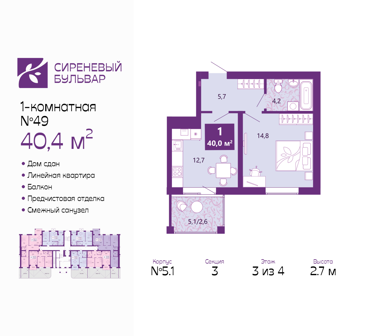 Продается 1-комн. квартира с предчистовой отделкой в ЖК "Сиреневый бульвар" на 3 этаже. Общая площадь: 40.4 кв.м., жилая: 14.8 кв.м., площадь просторной кухни-столовой: 12.7 кв.м. Все окна выходят на одну сторону. В квартире один балкон, один совмещенный санузел. Высота потолков 2.7 м. Дом монолитный, многоподъездный, высотой 4 этажа. Квартира находится в 3-й секции в корпусе 5.1. На этаже 4 квартиры. В подъезде 1 грузовой лифт. Дом сдан. Оформление сделки по договору купли-продажи. Жилой комплекс "Сиреневый бульвар" это 5 клубных 4-х этажных домов на 16 квартир и 9 домов с несколькими секциями. Вместе эти дома формируют собственное закрытое пространство с дворовыми территориями, спортивными и детскими площадками, местами отдыха и коммерческими помещениями. Дизайнерские входные группы и небольшие приусадебные участки квартир нижних этажей, обилие зелени, удобные зоны отдыха – всё устроено с особым вниманием. Жителей комплекса ждут просторные квартиры комфорт-класса с огромными террасами, мастер-спальнями, гардеробными и кухнями-гостиными. В каждом доме предусмотрены места для хранения велосипедов, кладовые помещения на цокольных этажах. "Сиреневый Бульвар" позволит своим жителям получить все преимущества городского комфорта и максимум плюсов от жизни на природе. Для жителей и гостей предусмотрены парковочные места, вся территория оборудована круглосуточной системой видеонаблюдения. В шаговой доступности находятся детский сад, начальная школа и продовольственные магазины. Жилой Комплекс "Сиреневый Бульвар" - уникальный проект, расположенный в Калининграде - балтийской жемчужине, в городе с богатым прошлым, комфортным настоящим и радужным будущим. Именно Калининград – место встречи России и Европы. Жилой Комплекс «Сиреневый Бульвар» находится в географическом центре города. Ленинградский район (бывшие Ротенштейн, Марауненхоф, Лип, Девау, Палве и Куммерау) – это северная часть Калининграда, где в довоенные годы располагался Старый город. Жилой комплекс находится рядом с Верхним озером, Нижним прудом и ещё 12 городскими водоемами. Территория всего проекта занимает 21,9 гектаров и находится между улицами Арсенальная, Пехотная и 4-ой Большой окружной. Аккредитация в банках: ПАО «Газпромбанк», «Сбербанк России», ПАО Банк «ВТБ», ПАО Банк «ФК Открытие», ПАО «Промсвязьбанк». (AQID02526630)