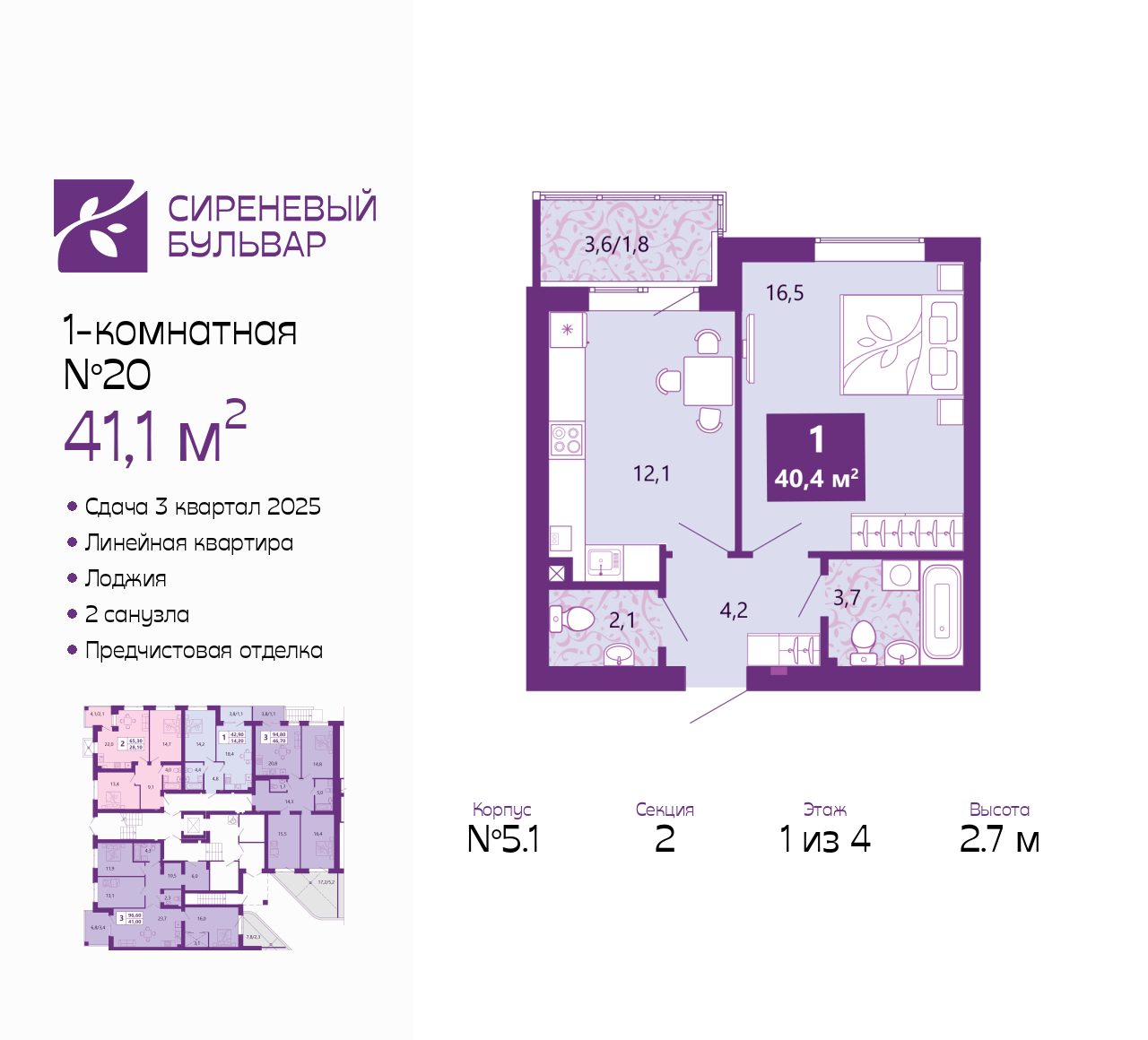 Продается однокомнатная квартира с предчистовой отделкой в ЖК "Сиреневый бульвар" на 1 этаже. Общая площадь: 41.1 кв.м., жилая: 16.5 кв.м., площадь просторной кухни-столовой: 12.1 кв.м. Все окна выходят на одну сторону. В квартире одна лоджия, один совмещенный и один раздельный санузел. Высота потолков 2.7 м. Дом монолитный, многоподъездный, высотой 4 этажа. Квартира находится во 2-й секции в корпусе 5.1. На этаже 6 квартир. В подъезде 1 грузовой лифт. Дом сдан. Оформление сделки по договору купли-продажи. Жилой комплекс "Сиреневый бульвар" это 5 клубных 4-х этажных домов на 16 квартир и 9 домов с несколькими секциями. Вместе эти дома формируют собственное закрытое пространство с дворовыми территориями, спортивными и детскими площадками, местами отдыха и коммерческими помещениями. Дизайнерские входные группы и небольшие приусадебные участки квартир нижних этажей, обилие зелени, удобные зоны отдыха – всё устроено с особым вниманием. Жителей комплекса ждут просторные квартиры комфорт-класса с огромными террасами, мастер-спальнями, гардеробными и кухнями-гостиными. В каждом доме предусмотрены места для хранения велосипедов, кладовые помещения на цокольных этажах. "Сиреневый Бульвар" позволит своим жителям получить все преимущества городского комфорта и максимум плюсов от жизни на природе. Для жителей и гостей предусмотрены парковочные места, вся территория оборудована круглосуточной системой видеонаблюдения. В шаговой доступности находятся детский сад, начальная школа и продовольственные магазины. Жилой Комплекс "Сиреневый Бульвар" - уникальный проект, расположенный в Калининграде - балтийской жемчужине, в городе с богатым прошлым, комфортным настоящим и радужным будущим. Именно Калининград – место встречи России и Европы. Жилой Комплекс «Сиреневый Бульвар» находится в географическом центре города. Ленинградский район (бывшие Ротенштейн, Марауненхоф, Лип, Девау, Палве и Куммерау) – это северная часть Калининграда, где в довоенные годы располагался Старый город. Жилой комплекс находится рядом с Верхним озером, Нижним прудом и ещё 12 городскими водоемами. Территория всего проекта занимает 21,9 гектаров и находится между улицами Арсенальная, Пехотная и 4-ой Большой окружной. Аккредитация в банках: ПАО «Газпромбанк», «Сбербанк России», ПАО Банк «ВТБ», ПАО Банк «ФК Открытие», ПАО «Промсвязьбанк». (AQID02499612)