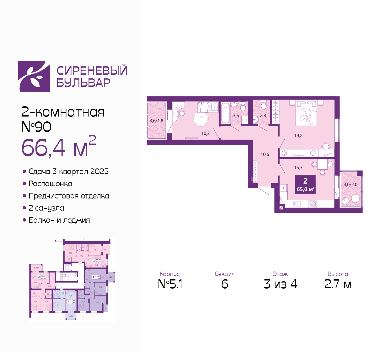 Просторная 2-комн. квартира с предчистовой отделкой в ЖК "Сиреневый бульвар" на 3 этаже. Общая площадь: 66.4 кв.м., жилая: 29.5 кв.м., площадь просторной кухни-столовой: 15.3 кв.м. Квартира - распашонка, без проходных комнат, окна выходят на paзные стороны дома. В квартире один балкон и одна лоджия, один совмещенный и один раздельный санузел. Высота потолков 2.7 м. Дом монолитный, многоподъездный, высотой 4 этажа. Квартира находится в 6-й секции в корпусе 5.1. На этаже 4 квартиры. В подъезде 1 грузовой лифт. Дом сдан. Оформление сделки по договору купли-продажи. Жилой комплекс "Сиреневый бульвар" это 5 клубных 4-х этажных домов на 16 квартир и 9 домов с несколькими секциями. Вместе эти дома формируют собственное закрытое пространство с дворовыми территориями, спортивными и детскими площадками, местами отдыха и коммерческими помещениями. Дизайнерские входные группы и небольшие приусадебные участки квартир нижних этажей, обилие зелени, удобные зоны отдыха – всё устроено с особым вниманием. Жителей комплекса ждут просторные квартиры комфорт-класса с огромными террасами, мастер-спальнями, гардеробными и кухнями-гостиными. В каждом доме предусмотрены места для хранения велосипедов, кладовые помещения на цокольных этажах. "Сиреневый Бульвар" позволит своим жителям получить все преимущества городского комфорта и максимум плюсов от жизни на природе. Для жителей и гостей предусмотрены парковочные места, вся территория оборудована круглосуточной системой видеонаблюдения. В шаговой доступности находятся детский сад, начальная школа и продовольственные магазины. Жилой Комплекс "Сиреневый Бульвар" - уникальный проект, расположенный в Калининграде - балтийской жемчужине, в городе с богатым прошлым, комфортным настоящим и радужным будущим. Именно Калининград – место встречи России и Европы. Жилой Комплекс «Сиреневый Бульвар» находится в географическом центре города. Ленинградский район (бывшие Ротенштейн, Марауненхоф, Лип, Девау, Палве и Куммерау) – это северная часть Калининграда, где в довоенные годы располагался Старый город. Жилой комплекс находится рядом с Верхним озером, Нижним прудом и ещё 12 городскими водоемами. Территория всего проекта занимает 21,9 гектаров и находится между улицами Арсенальная, Пехотная и 4-ой Большой окружной. Аккредитация в банках: «Сбербанк России», ПАО Банк «ВТБ», ПАО «Газпромбанк», ПАО Банк «ФК Открытие», ПАО «Промсвязьбанк». (AQID02499638)