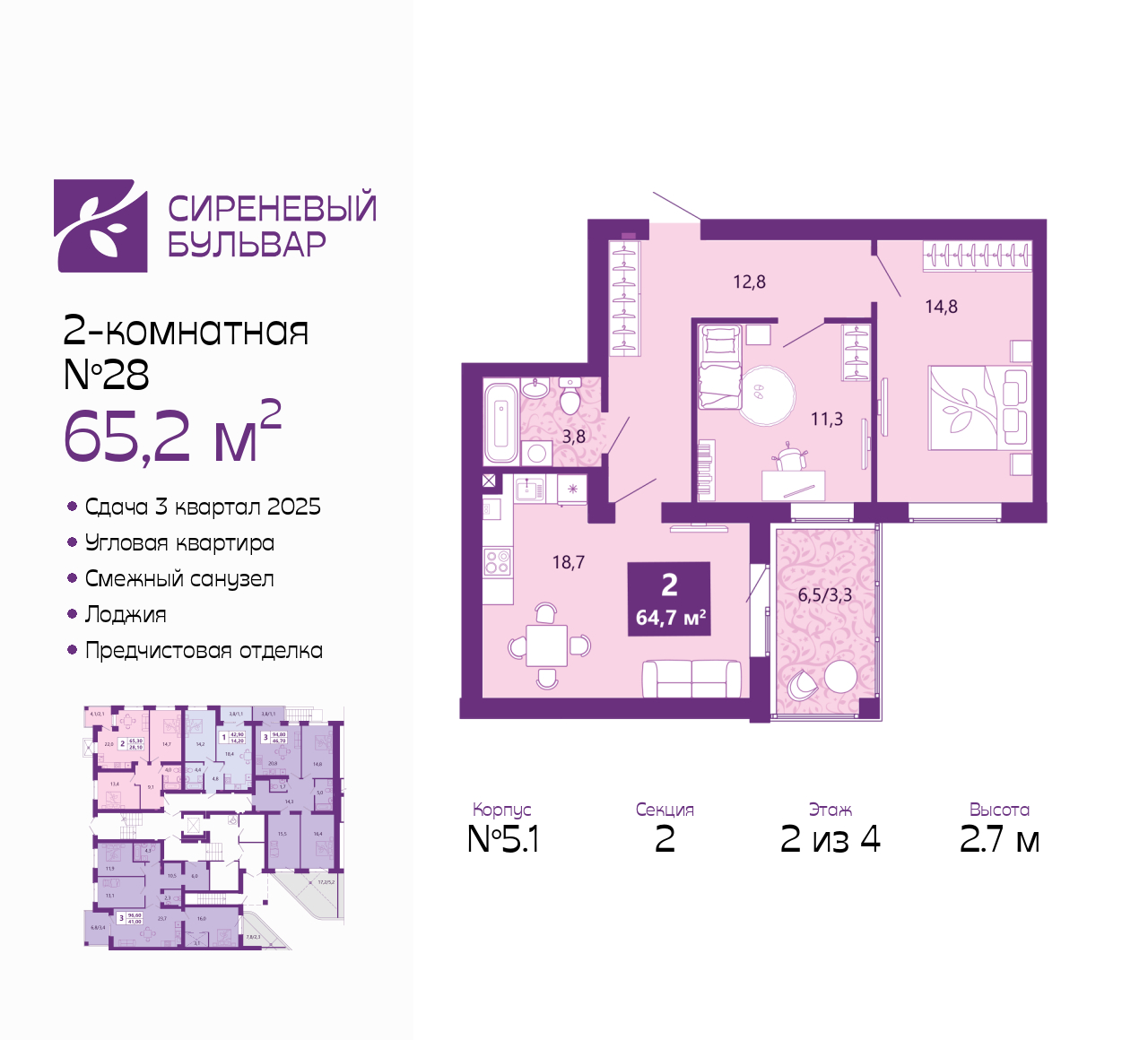 2-комн. квартира с предчистовой отделкой в ЖК "Сиреневый бульвар" на 2 этаже. Общая площадь: 65.2 кв.м., жилая: 26.1 кв.м., площадь просторной кухни-столовой: 18.7 кв.м. Угловая квартира, идеально подойдет любителям тишины и панорамных видов. В квартире одна лоджия, один совмещенный санузел. Высота потолков 2.7 м. Дом монолитный, многоподъездный, высотой 4 этажа. Квартира находится во 2-й секции в корпусе 5.1. На этаже 6 квартир. В подъезде 1 грузовой лифт. Дом сдан. Оформление сделки по договору купли-продажи. Жилой комплекс "Сиреневый бульвар" это 5 клубных 4-х этажных домов на 16 квартир и 9 домов с несколькими секциями. Вместе эти дома формируют собственное закрытое пространство с дворовыми территориями, спортивными и детскими площадками, местами отдыха и коммерческими помещениями. Дизайнерские входные группы и небольшие приусадебные участки квартир нижних этажей, обилие зелени, удобные зоны отдыха – всё устроено с особым вниманием. Жителей комплекса ждут просторные квартиры комфорт-класса с огромными террасами, мастер-спальнями, гардеробными и кухнями-гостиными. В каждом доме предусмотрены места для хранения велосипедов, кладовые помещения на цокольных этажах. "Сиреневый Бульвар" позволит своим жителям получить все преимущества городского комфорта и максимум плюсов от жизни на природе. Для жителей и гостей предусмотрены парковочные места, вся территория оборудована круглосуточной системой видеонаблюдения. В шаговой доступности находятся детский сад, начальная школа и продовольственные магазины. Жилой Комплекс "Сиреневый Бульвар" - уникальный проект, расположенный в Калининграде - балтийской жемчужине, в городе с богатым прошлым, комфортным настоящим и радужным будущим. Именно Калининград – место встречи России и Европы. Жилой Комплекс «Сиреневый Бульвар» находится в географическом центре города. Ленинградский район (бывшие Ротенштейн, Марауненхоф, Лип, Девау, Палве и Куммерау) – это северная часть Калининграда, где в довоенные годы располагался Старый город. Жилой комплекс находится рядом с Верхним озером, Нижним прудом и ещё 12 городскими водоемами. Территория всего проекта занимает 21,9 гектаров и находится между улицами Арсенальная, Пехотная и 4-ой Большой окружной. Аккредитация в банках: ПАО Банк «ВТБ», «Сбербанк России», ПАО «Газпромбанк», ПАО «Промсвязьбанк», ПАО Банк «ФК Открытие». (AQID02499614)