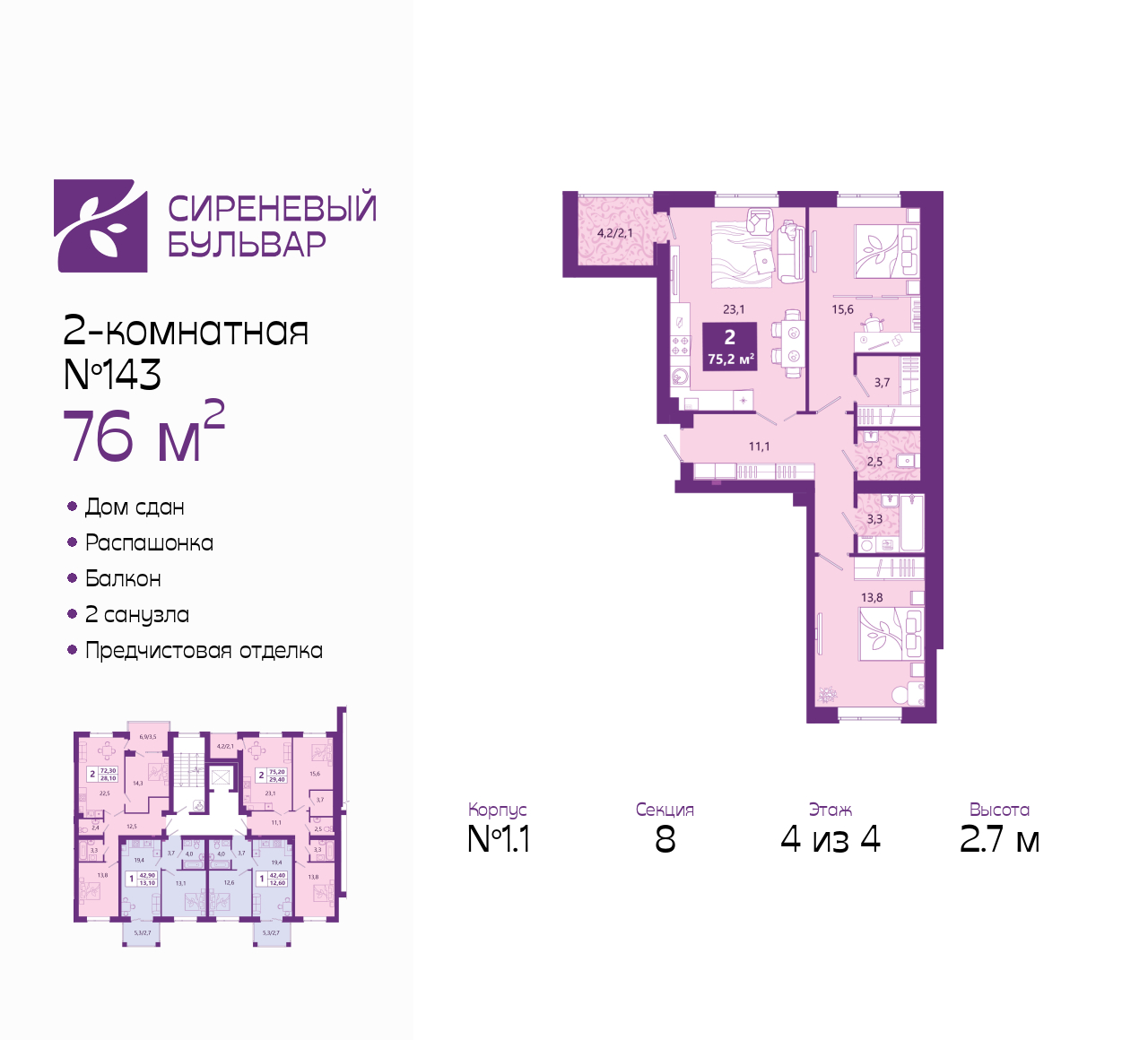 2-комн. квартира с предчистовой отделкой в ЖК "Сиреневый бульвар" на 4 этаже. Общая площадь: 76 кв.м., жилая: 29.4 кв.м., площадь просторной кухни-столовой: 23.1 кв.м. Квартира - распашонка, без проходных комнат, окна выходят на paзные стороны дома. В квартире один балкон, один совмещенный и один раздельный санузел. Высота потолков 2.7 м. Дом введен в эксплуатацию. Дом монолитный, многоподъездный, высотой 4 этажа. Квартира находится в 8-й секции в корпусе 1.1. На этаже 4 квартиры. В подъезде 1 грузовой лифт. Начало строительства - 4 квартал 2022 года. На сегодняшний день строительство завершено, дом сдан в 1 квартале 2024 года. Оформление сделки по договору купли-продажи. Жилой комплекс "Сиреневый бульвар" это 5 клубных 4-х этажных домов на 16 квартир и 9 домов с несколькими секциями. Вместе эти дома формируют собственное закрытое пространство с дворовыми территориями, спортивными и детскими площадками, местами отдыха и коммерческими помещениями. Дизайнерские входные группы и небольшие приусадебные участки квартир нижних этажей, обилие зелени, удобные зоны отдыха – всё устроено с особым вниманием. Жителей комплекса ждут просторные квартиры комфорт-класса с огромными террасами, мастер-спальнями, гардеробными и кухнями-гостиными. В каждом доме предусмотрены места для хранения велосипедов, кладовые помещения на цокольных этажах. "Сиреневый Бульвар" позволит своим жителям получить все преимущества городского комфорта и максимум плюсов от жизни на природе. Для жителей и гостей предусмотрены парковочные места, вся территория оборудована круглосуточной системой видеонаблюдения. В шаговой доступности находятся детский сад, начальная школа и продовольственные магазины. Жилой Комплекс "Сиреневый Бульвар" - уникальный проект, расположенный в Калининграде - балтийской жемчужине, в городе с богатым прошлым, комфортным настоящим и радужным будущим. Именно Калининград – место встречи России и Европы. Жилой Комплекс «Сиреневый Бульвар» находится в географическом центре города. Ленинградский район (бывшие Ротенштейн, Марауненхоф, Лип, Девау, Палве и Куммерау) – это северная часть Калининграда, где в довоенные годы располагался Старый город. Жилой комплекс находится рядом с Верхним озером, Нижним прудом и ещё 12 городскими водоемами. Территория всего проекта занимает 21,9 гектаров и находится между улицами Арсенальная, Пехотная и 4-ой Большой окружной. Аккредитация в банках: ПАО Банк «ВТБ», «Сбербанк России», ПАО «Газпромбанк», ПАО Банк «ФК Открытие», ПАО «Промсвязьбанк». (AQID02374742)