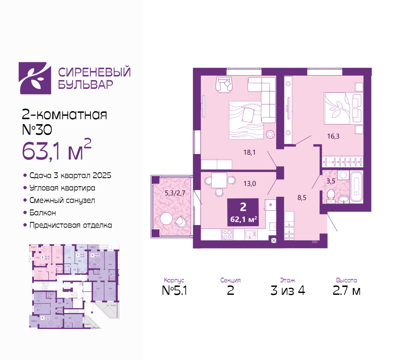 Продается двухкомнатная квартира с предчистовой отделкой в ЖК "Сиреневый бульвар" на 3 этаже. Общая площадь: 63.1 кв.м., жилая: 34.4 кв.м., площадь просторной кухни-столовой: 13 кв.м. Угловая квартира, идеально подойдет любителям тишины и панорамных видов. В квартире один балкон, один совмещенный санузел. Высота потолков 2.7 м. Дом монолитный, многоподъездный, высотой 4 этажа. Квартира находится во 2-й секции в корпусе 5.1. На этаже 6 квартир. В подъезде 1 грузовой лифт. Окончание строительства - 4 квартал 2025 года. Оформление сделки по договору долевого участия. Жилой комплекс "Сиреневый бульвар" это 5 клубных 4-х этажных домов на 16 квартир и 9 домов с несколькими секциями. Вместе эти дома формируют собственное закрытое пространство с дворовыми территориями, спортивными и детскими площадками, местами отдыха и коммерческими помещениями. Дизайнерские входные группы и небольшие приусадебные участки квартир нижних этажей, обилие зелени, удобные зоны отдыха – всё устроено с особым вниманием. Жителей комплекса ждут просторные квартиры комфорт-класса с огромными террасами, мастер-спальнями, гардеробными и кухнями-гостиными. В каждом доме предусмотрены места для хранения велосипедов, кладовые помещения на цокольных этажах. "Сиреневый Бульвар" позволит своим жителям получить все преимущества городского комфорта и максимум плюсов от жизни на природе. Для жителей и гостей предусмотрены парковочные места, вся территория оборудована круглосуточной системой видеонаблюдения. В шаговой доступности находятся детский сад, начальная школа и продовольственные магазины. Жилой Комплекс "Сиреневый Бульвар" - уникальный проект, расположенный в Калининграде - балтийской жемчужине, в городе с богатым прошлым, комфортным настоящим и радужным будущим. Именно Калининград – место встречи России и Европы. Жилой Комплекс «Сиреневый Бульвар» находится в географическом центре города. Ленинградский район (бывшие Ротенштейн, Марауненхоф, Лип, Девау, Палве и Куммерау) – это северная часть Калининграда, где в довоенные годы располагался Старый город. Жилой комплекс находится рядом с Верхним озером, Нижним прудом и ещё 12 городскими водоемами. Территория всего проекта занимает 21,9 гектаров и находится между улицами Арсенальная, Пехотная и 4-ой Большой окружной. Аккредитация в банках: ПАО Банк «ВТБ», «Сбербанк России», ПАО «Газпромбанк», ПАО Банк «ФК Открытие», ПАО «Промсвязьбанк». (AQID02499615)