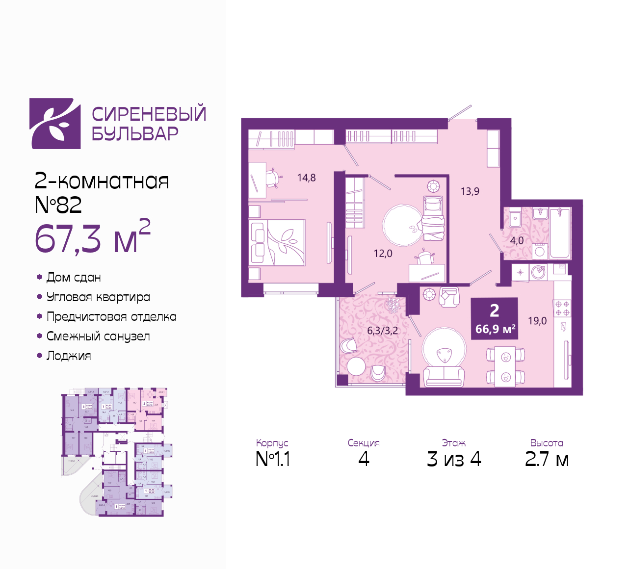 2-комн. квартира с предчистовой отделкой в ЖК "Сиреневый бульвар" на 3 этаже. Общая площадь: 67.3 кв.м., жилая: 26.8 кв.м., площадь просторной кухни-столовой: 19 кв.м. Квартира угловая, очень светлая, естественная вентиляция при открытии окон. В квартире одна лоджия, один совмещенный санузел. Наличие в квартире террасы открывает возможность для обустройства дополнительной площади. Высота потолков 2.7 м. Дом введен в эксплуатацию. Дом монолитный, многоподъездный, высотой 4 этажа. Квартира находится в 4-й секции в корпусе 1.1. На этаже 7 квартир. В подъезде 1 грузовой лифт. Начало строительства - 4 квартал 2022 года. Строительство завершено, дом сдан в 1 квартале 2024 года. Оформление сделки по договору купли-продажи. Жилой комплекс "Сиреневый бульвар" это 5 клубных 4-х этажных домов на 16 квартир и 9 домов с несколькими секциями. Вместе эти дома формируют собственное закрытое пространство с дворовыми территориями, спортивными и детскими площадками, местами отдыха и коммерческими помещениями. Дизайнерские входные группы и небольшие приусадебные участки квартир нижних этажей, обилие зелени, удобные зоны отдыха – всё устроено с особым вниманием. Жителей комплекса ждут просторные квартиры комфорт-класса с огромными террасами, мастер-спальнями, гардеробными и кухнями-гостиными. В каждом доме предусмотрены места для хранения велосипедов, кладовые помещения на цокольных этажах. "Сиреневый Бульвар" позволит своим жителям получить все преимущества городского комфорта и максимум плюсов от жизни на природе. Для жителей и гостей предусмотрены парковочные места, вся территория оборудована круглосуточной системой видеонаблюдения. В шаговой доступности находятся детский сад, начальная школа и продовольственные магазины. Жилой Комплекс "Сиреневый Бульвар" - уникальный проект, расположенный в Калининграде - балтийской жемчужине, в городе с богатым прошлым, комфортным настоящим и радужным будущим. Именно Калининград – место встречи России и Европы. Жилой Комплекс «Сиреневый Бульвар» находится в географическом центре города. Ленинградский район (бывшие Ротенштейн, Марауненхоф, Лип, Девау, Палве и Куммерау) – это северная часть Калининграда, где в довоенные годы располагался Старый город. Жилой комплекс находится рядом с Верхним озером, Нижним прудом и ещё 12 городскими водоемами. Территория всего проекта занимает 21,9 гектаров и находится между улицами Арсенальная, Пехотная и 4-ой Большой окружной. Аккредитация в банках: «Сбербанк России», ПАО Банк «ВТБ», ПАО «Газпромбанк», ПАО «Промсвязьбанк», ПАО Банк «ФК Открытие». (AQID02438316)
