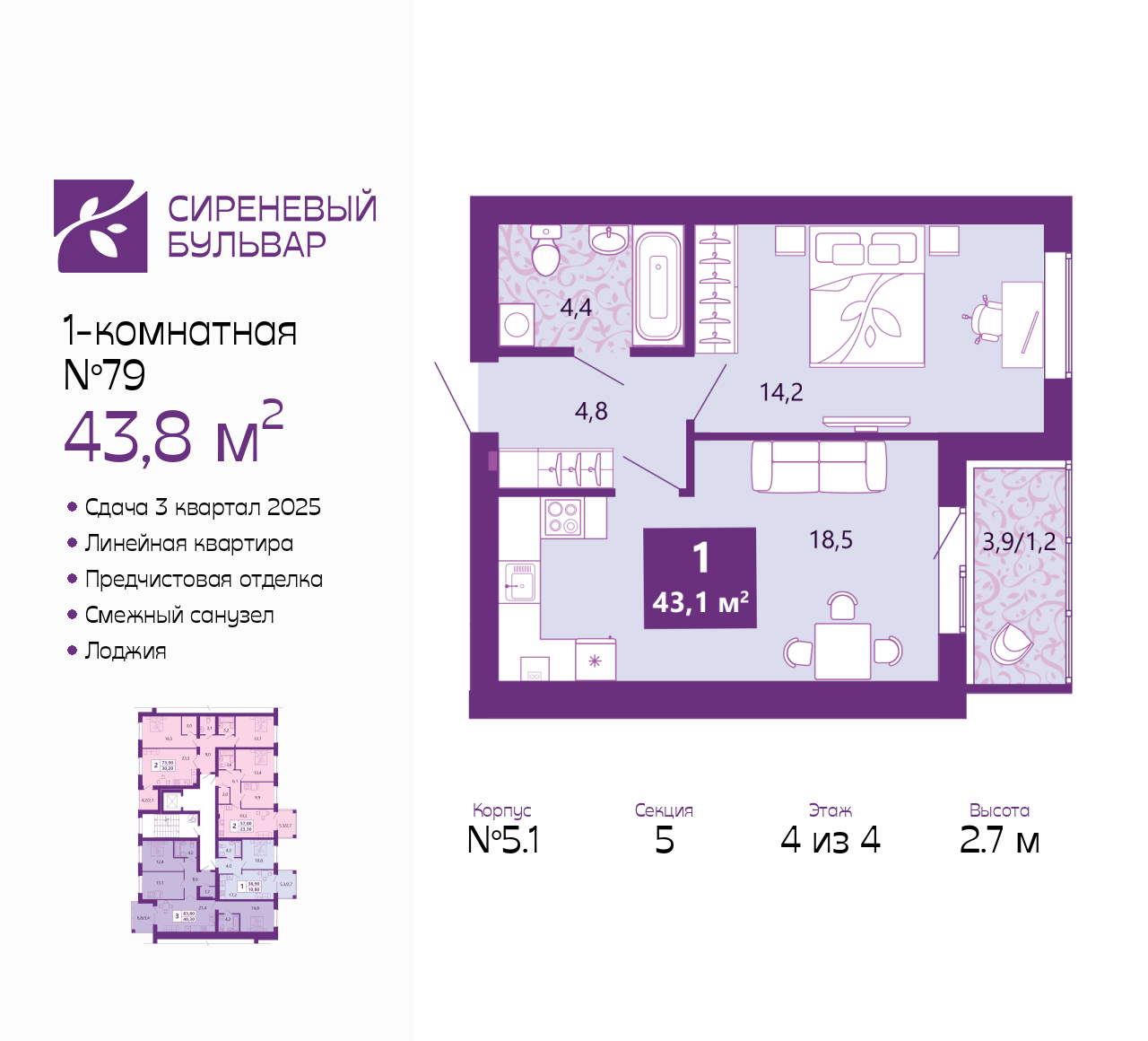Продается 1-комн. квартира с предчистовой отделкой в ЖК "Сиреневый бульвар" на 4 этаже. Общая площадь: 43.8 кв.м., жилая: 14.2 кв.м., площадь просторной кухни-столовой: 18.5 кв.м. Все окна выходят на одну сторону. В квартире одна лоджия, один совмещенный санузел. Высота потолков 2.7 м. Дом монолитный, многоподъездный, высотой 4 этажа. Квартира находится в 5-й секции в корпусе 5.1. На этаже 5 квартир. В подъезде 1 грузовой лифт. Дом сдан. Оформление сделки по договору купли-продажи. Жилой комплекс "Сиреневый бульвар" это 5 клубных 4-х этажных домов на 16 квартир и 9 домов с несколькими секциями. Вместе эти дома формируют собственное закрытое пространство с дворовыми территориями, спортивными и детскими площадками, местами отдыха и коммерческими помещениями. Дизайнерские входные группы и небольшие приусадебные участки квартир нижних этажей, обилие зелени, удобные зоны отдыха – всё устроено с особым вниманием. Жителей комплекса ждут просторные квартиры комфорт-класса с огромными террасами, мастер-спальнями, гардеробными и кухнями-гостиными. В каждом доме предусмотрены места для хранения велосипедов, кладовые помещения на цокольных этажах. "Сиреневый Бульвар" позволит своим жителям получить все преимущества городского комфорта и максимум плюсов от жизни на природе. Для жителей и гостей предусмотрены парковочные места, вся территория оборудована круглосуточной системой видеонаблюдения. В шаговой доступности находятся детский сад, начальная школа и продовольственные магазины. Жилой Комплекс "Сиреневый Бульвар" - уникальный проект, расположенный в Калининграде - балтийской жемчужине, в городе с богатым прошлым, комфортным настоящим и радужным будущим. Именно Калининград – место встречи России и Европы. Жилой Комплекс «Сиреневый Бульвар» находится в географическом центре города. Ленинградский район (бывшие Ротенштейн, Марауненхоф, Лип, Девау, Палве и Куммерау) – это северная часть Калининграда, где в довоенные годы располагался Старый город. Жилой комплекс находится рядом с Верхним озером, Нижним прудом и ещё 12 городскими водоемами. Территория всего проекта занимает 21,9 гектаров и находится между улицами Арсенальная, Пехотная и 4-ой Большой окружной. Аккредитация в банках: ПАО Банк «ВТБ», «Сбербанк России», ПАО «Газпромбанк», ПАО «Промсвязьбанк», ПАО Банк «ФК Открытие». (AQID02499634)
