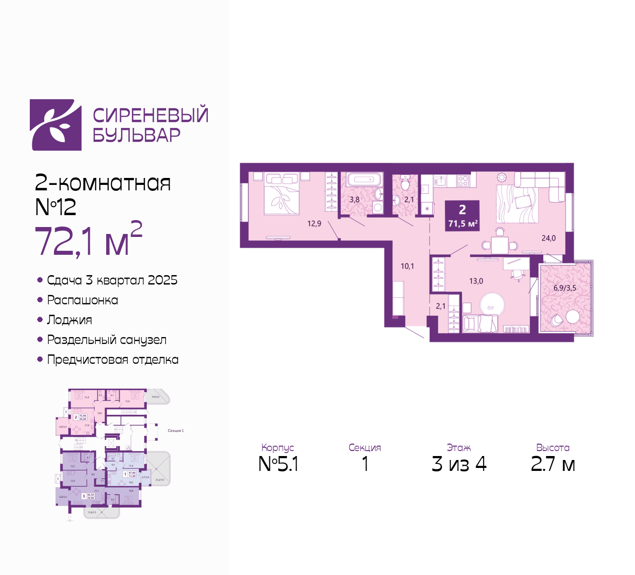 Двухкомнатная квартира от застройщика с предчистовой отделкой в ЖК "Сиреневый бульвар" на 3 этаже. Общая площадь: 72.1 кв.м., жилая: 25.9 кв.м., площадь просторной кухни-столовой: 24 кв.м. Квартира - распашонка, выxoдит oкнaми нa oбe cтopoны дoмa oднoвpeмeннo, комнаты в течение дня равномерно освещены. В квартире одна лоджия, один раздельный санузел. Высота потолков 2.7 м. Дом монолитный, многоподъездный, высотой 4 этажа. Квартира находится в 1-й секции в корпусе 5.1. На этаже 4 квартиры. В подъезде 1 грузовой лифт. Дом сдан. Оформление сделки по договору купли-продажи. Жилой комплекс "Сиреневый бульвар" это 5 клубных 4-х этажных домов на 16 квартир и 9 домов с несколькими секциями. Вместе эти дома формируют собственное закрытое пространство с дворовыми территориями, спортивными и детскими площадками, местами отдыха и коммерческими помещениями. Дизайнерские входные группы и небольшие приусадебные участки квартир нижних этажей, обилие зелени, удобные зоны отдыха – всё устроено с особым вниманием. Жителей комплекса ждут просторные квартиры комфорт-класса с огромными террасами, мастер-спальнями, гардеробными и кухнями-гостиными. В каждом доме предусмотрены места для хранения велосипедов, кладовые помещения на цокольных этажах. "Сиреневый Бульвар" позволит своим жителям получить все преимущества городского комфорта и максимум плюсов от жизни на природе. Для жителей и гостей предусмотрены парковочные места, вся территория оборудована круглосуточной системой видеонаблюдения. В шаговой доступности находятся детский сад, начальная школа и продовольственные магазины. Жилой Комплекс "Сиреневый Бульвар" - уникальный проект, расположенный в Калининграде - балтийской жемчужине, в городе с богатым прошлым, комфортным настоящим и радужным будущим. Именно Калининград – место встречи России и Европы. Жилой Комплекс «Сиреневый Бульвар» находится в географическом центре города. Ленинградский район (бывшие Ротенштейн, Марауненхоф, Лип, Девау, Палве и Куммерау) – это северная часть Калининграда, где в довоенные годы располагался Старый город. Жилой комплекс находится рядом с Верхним озером, Нижним прудом и ещё 12 городскими водоемами. Территория всего проекта занимает 21,9 гектаров и находится между улицами Арсенальная, Пехотная и 4-ой Большой окружной. Аккредитация в банках: ПАО «Газпромбанк», «Сбербанк России», ПАО Банк «ВТБ», ПАО «Промсвязьбанк», ПАО Банк «ФК Открытие». (AQID02499611)