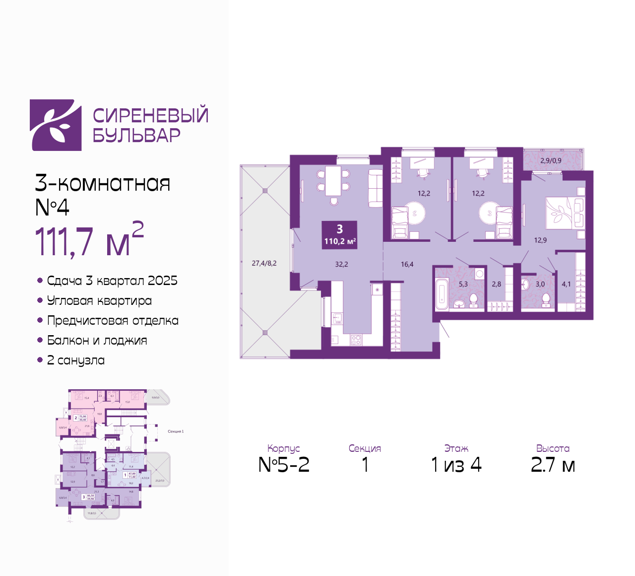 - Общая площадь 111.7 м²